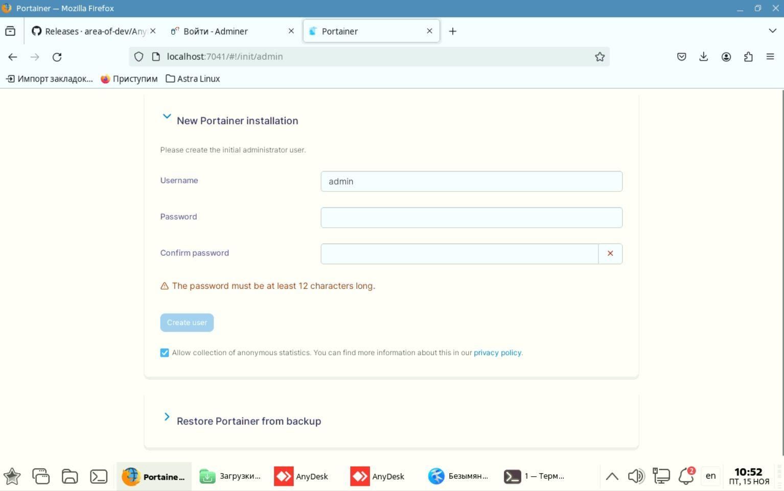 Установка Portainer в Docker (Вариант 2) Portainer в Docker — самый правильный и современный вариант 2025 года (одним файлом docker-compose.yml + HTTPS + Nginx Proxy Manager / Caddy) «Золотой стандарт» 2025 года — именно так ставят 99 % людей: mkdir -p ~/portainer && cd ~/portainer # docker-compose.yml — вечная классика 2025 cat > docker-compose.yml << 'EOF' version: "3.9" services: portainer: image: portainer/portainer-ce:latest container_name: portainer restart: unless-stopped security_opt: - no-new-privileges:true volumes: - /var/run/docker.sock:/var/run/docker.sock:ro - data:/data ports: - "9000:9000" # веб-интерфейс - "9443:9443" # HTTPS (встроенный в Portainer) - "8000:8000" # для Edge Agent (если будешь подключать удалённые хосты) environment: - TZ=Europe/Moscow # (Опционально) Caddy — сразу HTTPS на 443 → Portainer caddy: image: caddy:2-alpine restart: unless-stopped ports: - "80:80" - "443:443" - "443:443/udp" volumes: - ./Caddyfile:/etc/caddy/Caddyfile - caddy_data:/data - caddy_config:/config volumes: data: caddy_data: caddy_config: EOF # Caddyfile — автоматический Let’s Encrypt cat > Caddyfile << 'EOF' portainer.твой-домен.рф { reverse_proxy localhost:9443 tls admin@твой-домен.рф } EOF docker compose up -d Готово! Через 30–60 секунд будет доступно сразу два адреса: https://portainer.твой-домен.рф — с нормальным сертификатом https://IP-сервера:9443 — встроенный HTTPS Portainer http://IP-сервера:9000 — старый порт (можно закрыть) Первый вход (2025) Логин: admin Пароль: минимум 12 символов Сразу снимай галочку «Send anonymous usage statistics» Полезные команды 2025 # Обновить Portainer до последней версии docker compose pull && docker compose up -d # Полные логи docker compose logs -f portainer # Полный бэкап (одна команда) docker run --rm -v portainer_data:/data -v $(pwd):/backup alpine tar -czf /backup/portainer-backup-$(date +%F).tar.gz -C /data . # Восстановление docker compose down docker run --rm -v portainer_data:/data -v ./portainer-backup-2025-12-01.tar.gz:/backup.tar.gz alpine sh -c "tar -xzf /backup.tar.gz -C /data --strip-components=1" docker compose up -d Полное удаление (если вдруг надо) cd ~/portainer docker compose down -v --remove-orphans docker volume rm portainer_data portainer_caddy_data portainer_caddy_config docker rmi portainer/portainer-ce caddy:2-alpine