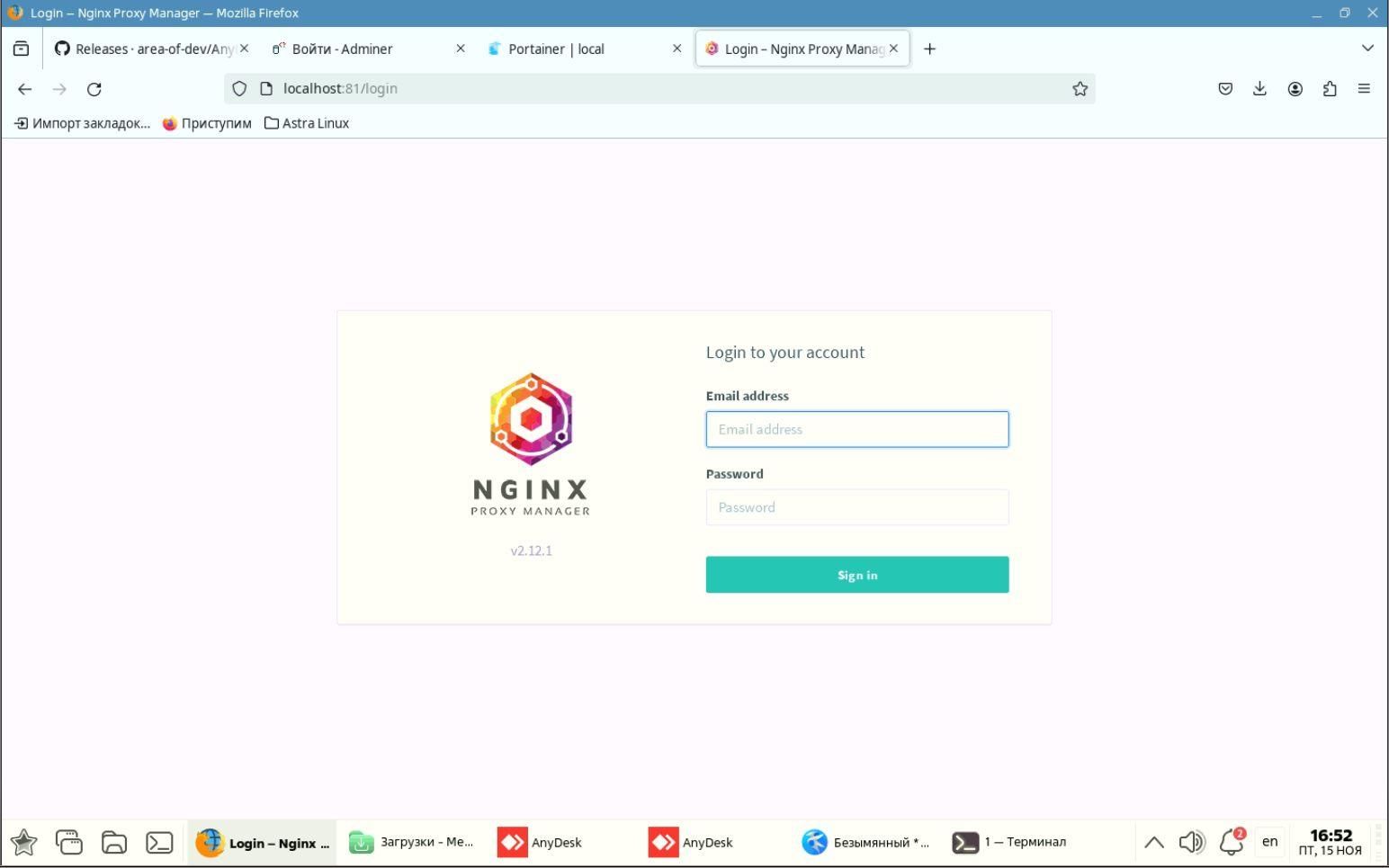 Установка NPM в Docker Nginx Proxy Manager - это веб-сервер с графическим интерфейсом, доступным через браузер. После установки интерфейс (админка) доступен на 81 порту. ======================================= Создаём каталог nginx_prm sudo mkdir nginx_prm Переходим в этот каталог cd nginx_prm Создаём файл docker-compose.yml sudo touch docker-compose.yml Открываем созданный файл: sudo nano docker-compose.yml Вставляем туда следующее содержимое: services: app: image: jc21/nginx-proxy-manager:latest restart: unless-stopped ports: - "80:80" - "443:443" - "81:81" - "10000:10000" volumes: - ./data:/data - ./letsencrypt:/etc/letsencrypt Среди пробрасываемых портов есть порт 10000, тут он для примера, как дополнительный порт, не входящий в список основных портов. Но если Nginx Proxy Manager будет использоваться, допустим, для Jitsi Meet, то этот порт следует оставить. Не забываем открыть эти порты в фаерволе и роутере (если есть). Запускаем командой: sudo docker compose up -d Данная команда применяется в случае, если Docker Compose установлен как плагин для Docker. Либо запускаем такой командой (в случае, если Docker Compose установлен как отдельный компонент, что актуально, например, для Astra Linux SE): sudo docker-compose up -d ========================= Переходим по адресу http://<ip-адрес>:81 (или http://localhost:81) [image: 1764661560846-npm.jpg] По умолчанию в Nginx Proxy Manager логин (e-mail) и пароль следующие: Логин: admin@example.com Пароль: changeme После входа сразу будет предложено сменить имя, ник, и адрес почты. Имя и ник позволяется оставить таким как есть, а адрес почты менять обязательно. Адрес не проверяется на существование, поэтом можно вписывать любой. После замены входных данных, нажимаем Save. [image: 1764661643968-npm2.jpg] В следующем окне предлагается сменить пароль. В верхнем поле вводим текущий пароль (changeme), в полях ниже - новый пароль , с подтверждением. Жмём кнопку Save. [image: 1764661654843-npm3.jpg] После этого появится интерфейс Nginx Proxy Manager. вверху есть вкладки. В основном наиболее востребована вкладка Hosts. Нажав на неё появится меню. Первый пункт меню (Proxy Hosts) открывает окно для привязки доменов к приложениям а также для создания сертификатов. [image: 1764661665716-npm4.jpg] В терминале выходим из каталога: cd ..