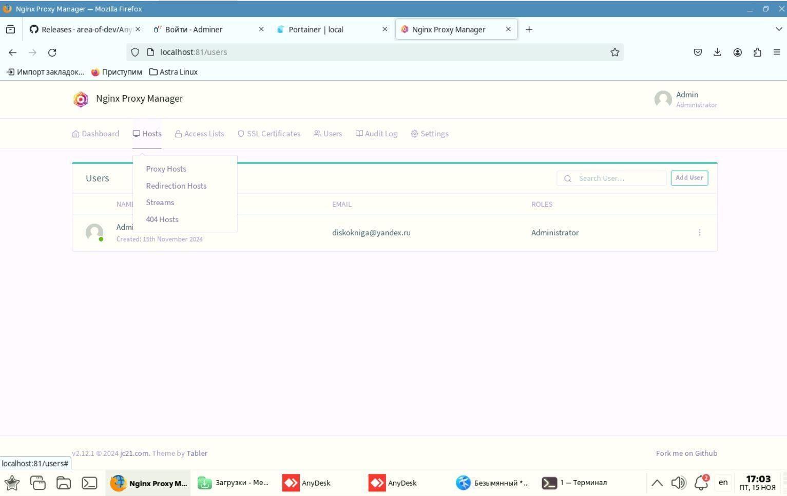 После этого появится интерфейс Nginx Proxy Manager. вверху есть вкладки.